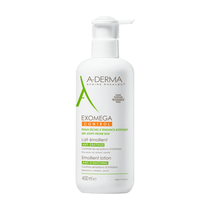 Lait Émolient Exomega Control d’Aderma apaise les démangeaisons, notamment sur les peaux sèches à tendance atopique. Convient à toute la famille.