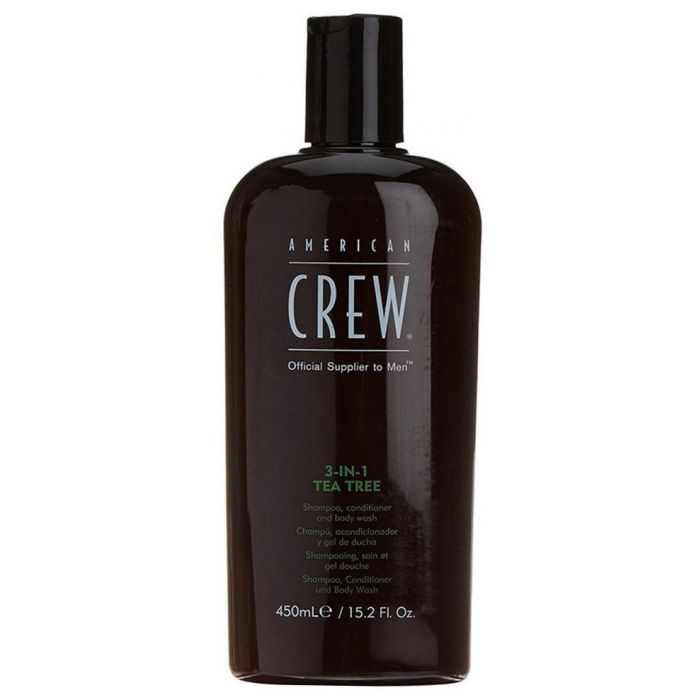 Le Shampoing, Après-shampoing et Gel Douche à l'Arbre à Thé AMERICAN CREW, 3 en 1, laisse les cheveux propres, conditionnés, brillants et doux. Tout en adoucissant et nettoyant la peau. De plus, il offre un agréable parfum rafraîchissant.