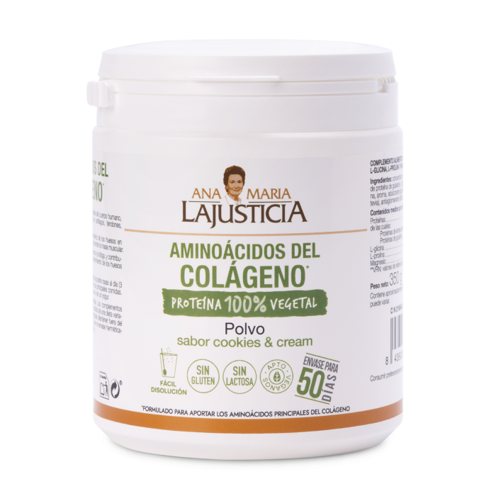 Découvrez les acides aminés du collagène de Ana María La Justicia, un complément en poudre de 350 grammes au goût cookies and cream, formulé pour apporter les acides aminés essentiels à la formation de collagène. Idéal pour celles et ceux qui recherchent une alternative végétale au collagène d’origine animale, sans renoncer à ses bienfaits.