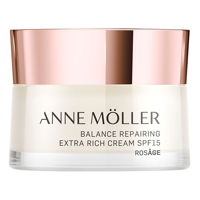 ANNE MOLLER Rosâge Crème de Jour Balance Extra Riche SPF15 rééquilibre les carences nutritionnelles causées par les changements hormonaux pour réparer visiblement la peau et lui redonner fermeté et éclat de santé.