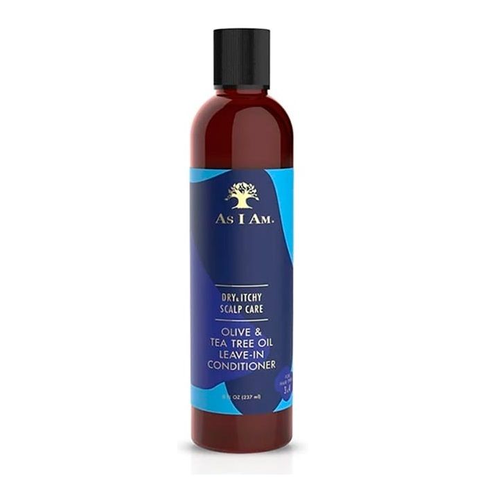 Le leave-in bleu de As I Am avec de l'huile d'olive et de l'arbre à thé est parfait pour combattre les pellicules, les irritations et les démangeaisons.