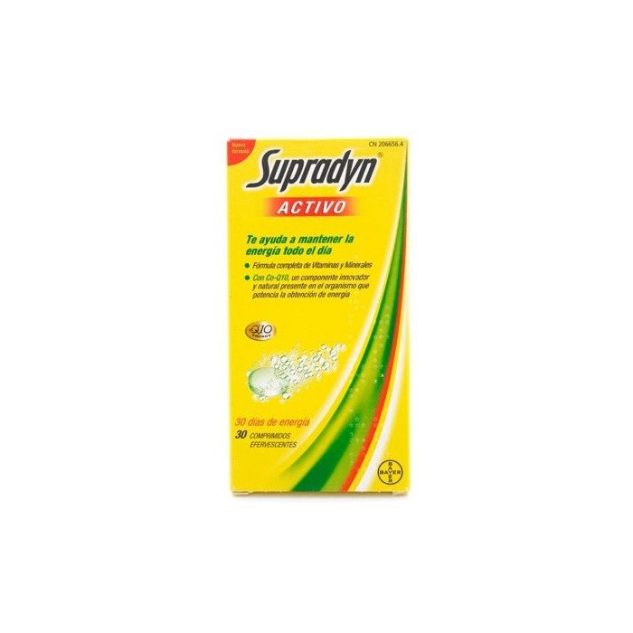 Supradyn Actif Comprimés Effervescents de Bayer est un complément alimentaire à base de vitamines, minéraux et oligo-éléments. Il aide à maintenir votre vitalité et votre énergie grâce à la coenzyme Q10, dans un format effervescent qui se dissout rapidement dans l’eau.