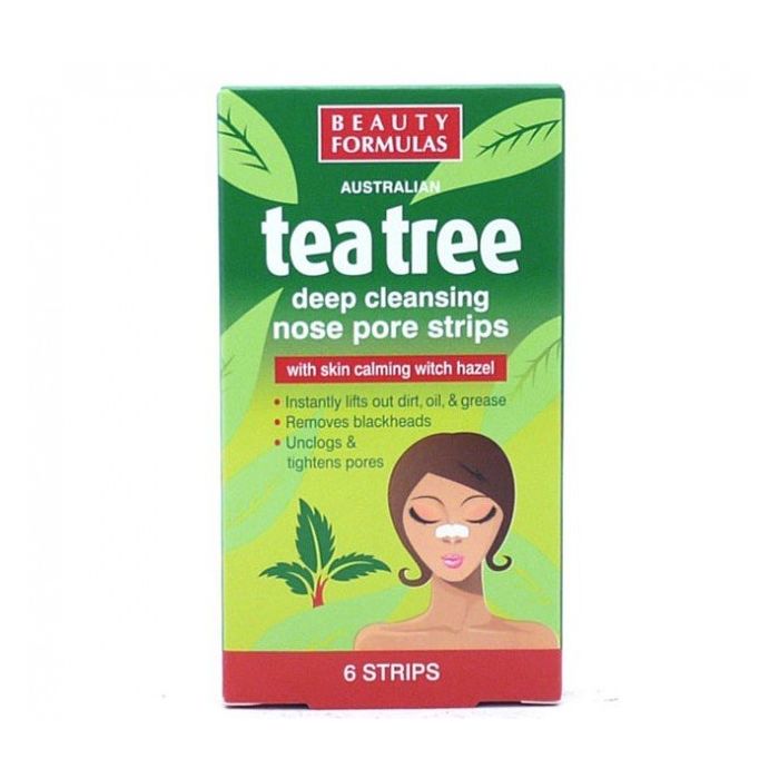 BEAUTY FORMULAS TEA TREE TIRES AU NEZ: Tires nettoyantes pour nez de Beauty Formulas. Ces tires de nettoyage de nez sont utiles pour éliminer les points noirs, sébum et autres débris qui bloquent les pores du nez et provoquent les anti-esthétiques à tiges.