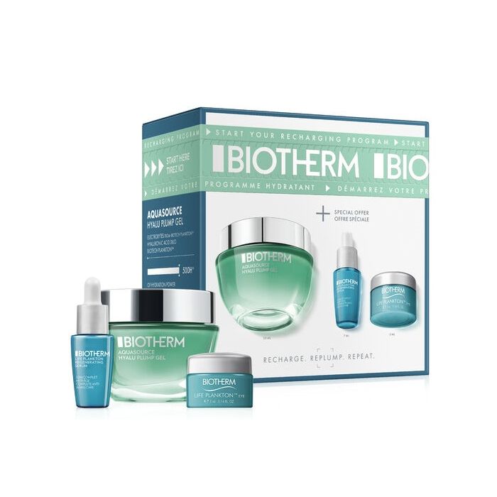 Le set de soin et routine visage Aquasource Hyalu Plump de Biotherm comprend trois essentiels pour hydrater, régénérer et protéger la peau :