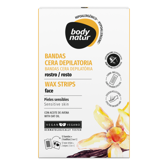 Bandes dépilatoires pour le visage Peaux Sensibles de Body Natur - Bandes dépilatoires hypoallergéniques à haute tolérance, enrichies en extrait naturel d'avoine, offrant une épilation parfaite et durable.