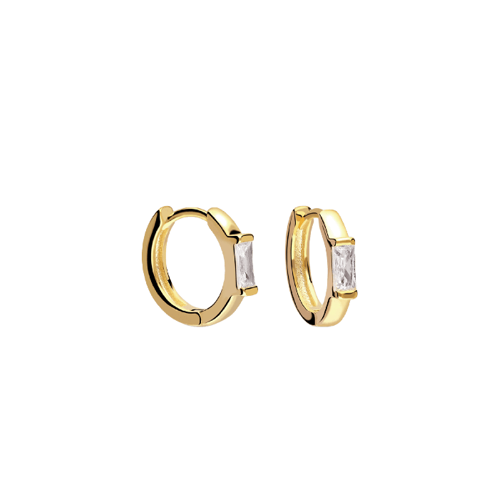 Les boucles d'oreilles Florence sont conçues en argent plaqué or 18 carats avec une pierre rectangulaire suspendue au centre de l’anneau. Un design géométrique et moderne qui apporte au visage une élégance maîtrisée et une lumière dorée.