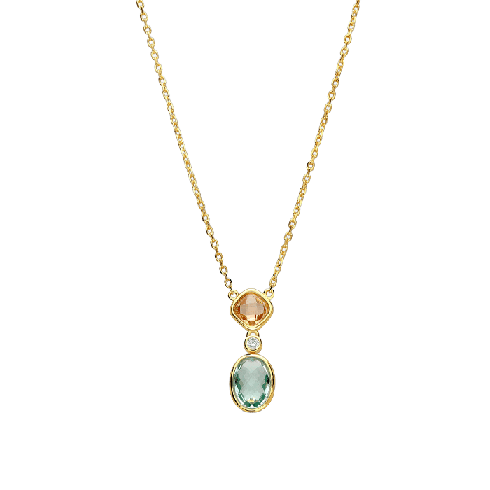Le collier Corail est conçu en argent plaqué or 18 carats avec deux gemmes aux tons marins. Un bijou qui évoque le mystère de l’océan et embellit avec une lumière tropicale.