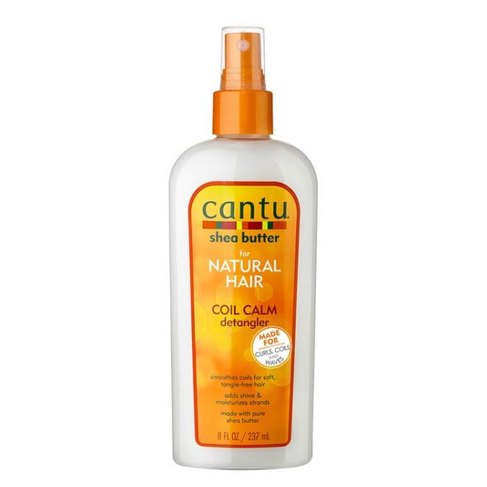 Le spray démêlant pour boucles Coil Calm Detangler Shea Butter For Natural Hair de Cantu adoucit et conditionne les cheveux, facilitant le coiffage tout en éliminant les nœuds.