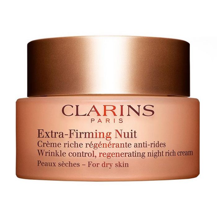 Avec la crème de nuit Extra Firming anti-rides Clarins pour la peau sèche à la peau, lisse, uniforme et nourrissante.