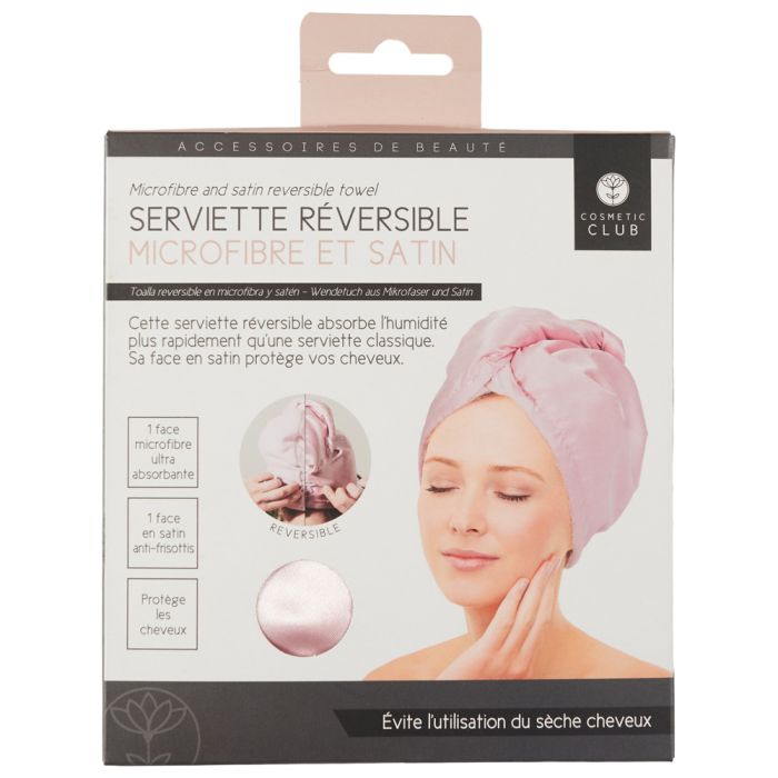 Profitez d'un séchage efficace et d'un soin supérieur avec la Serviette Réversible en Microfibre et Satin, conçue pour offrir le meilleur en matière d'absorption et de protection pour vos cheveux.
