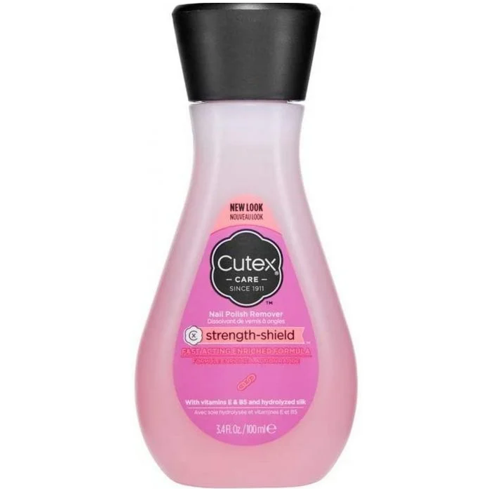 Le dissolvant Cutex Strength-Shield, enrichi en vitamines E, B5 et en soie hydrolysée, aide à préserver et protéger l’aspect sain des ongles tout en éliminant le vernis.