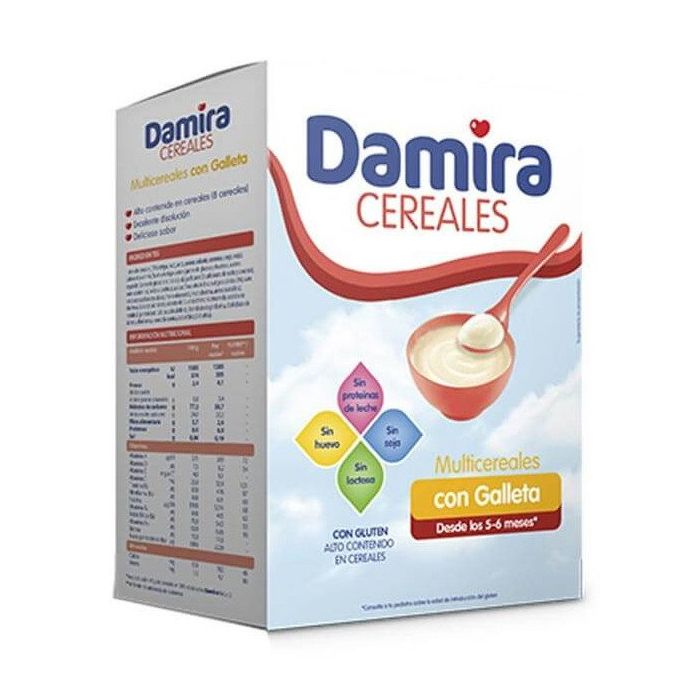 Bouillie 8 Céréales avec Biscuit Maria de Damira: C’est une omelette pour les plus petits avec une combinaison très variée de céréales, de biscuits à base de fruits de mer et sans allergènes. Ce sont des céréales de poursuite alimentaire pour les bébés qui ont besoin d’éliminer de leur régime les protéines du lait de vache, du lactose, du soja et de l’œuf.