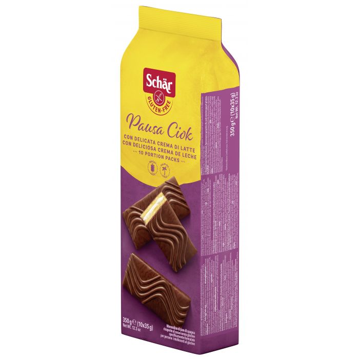 DR SCHÄR PAUSA CIOK : Petits gâteaux moelleux à la crème de lait délicate, enrobés de cacao. Ce produit est élaboré à partir d’ingrédients exempts de gluten et de blé.