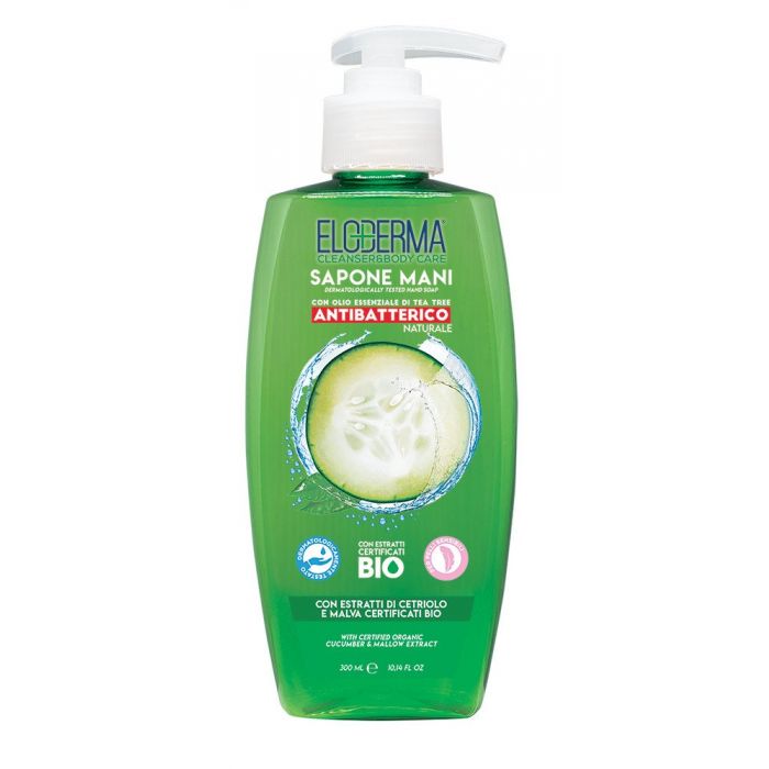 Le Savon pour les Mains Antibactérien à l'Extrait de Concombre d'Eloderma contient de l'huile essentielle d'arbre à thé ainsi que des extraits certifiés BIO pour répondre aux différents besoins de votre peau.