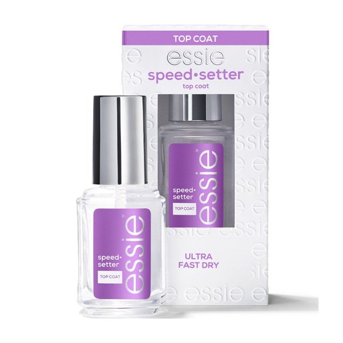 Le Top Coat Speed Setter de Essie s’applique après deux couches de vernis coloré pour un séchage express, tout en offrant une finition lisse, longue tenue et ultra brillante.