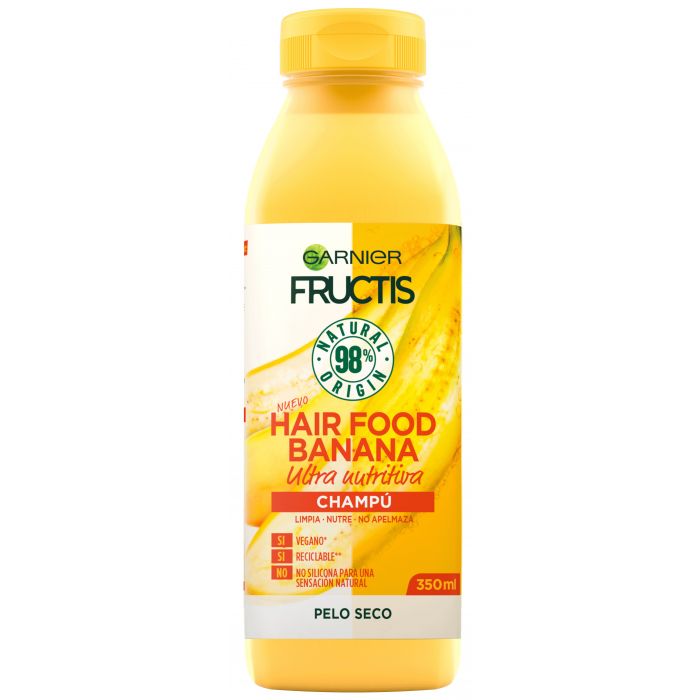 Hair Food Banana Ultra Nutrivive Shampoing de Fructis est élaboré avec 98 % d’ingrédients d’origine naturelle (2 % restants garantissant la sensorialité et une bonne conservation de la formule), végétalien et testé dermatologiquement.
