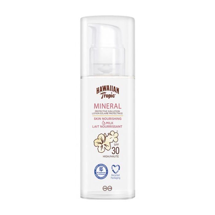 Hawaiian Tropic™ Lait minéral nourrissant pour la peau, une lotion solaire avec des filtres 100 % minéraux pour la protection contre les UVA et les UVB.