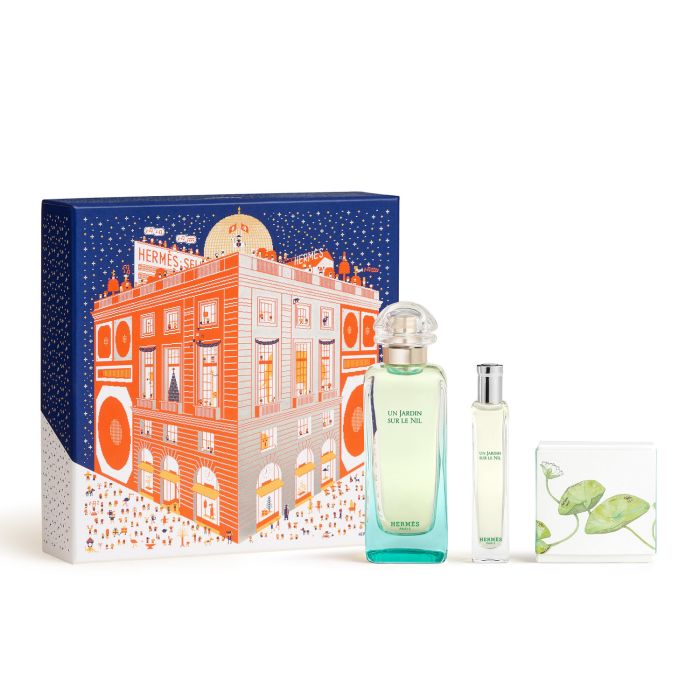 Le coffret se compose de l’Eau de Toilette Un Jardin sur le Nil (100 ml), d’un format voyage de l’Eau de Toilette (15 ml) et d’un savon parfumé (50 g).