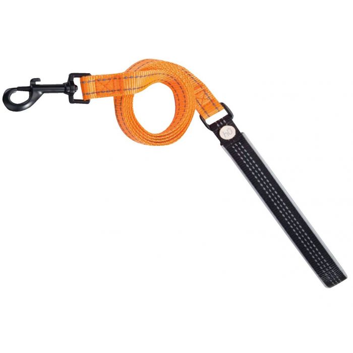 Laisse en nylon réflecteur dans le noir avec mousqueton réalisé en alliage de zinc chromé noir, très résistant. La poignée est en néoprène. Non réglable.