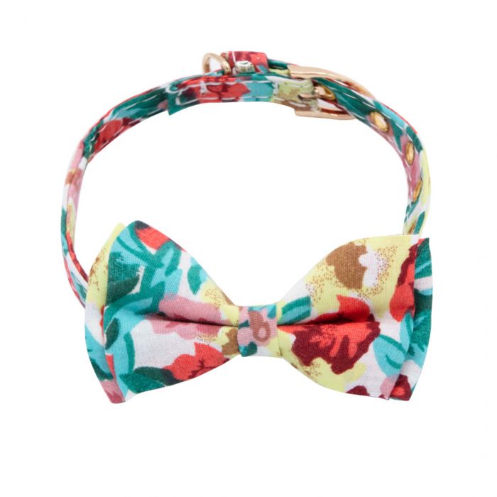 Collier flexible doublé d'un tissu en coton doux et ajustable. Comprend un nœud papillon assorti à motifs que vous pouvez facilement mettre et enlever. Les rivets, la boucle et l'anneau sont en ton or.