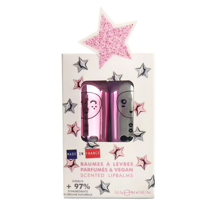 Adorables baumes à lèvres présentés en duo, véganes et parfumés.