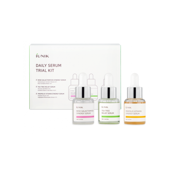 Le kit d'essai du sérum quotidien iUNIK combine le pouvoir de trois sérums différents. Le sérum Tea Tree Relief cible le contrôle de la sébum et affine les pores, le sérum Rose Galactomyces Synergy hydrate profondément la peau et le sérum Propolis Vitamin Synergy combat les rides et éclaircit le teint de la peau.