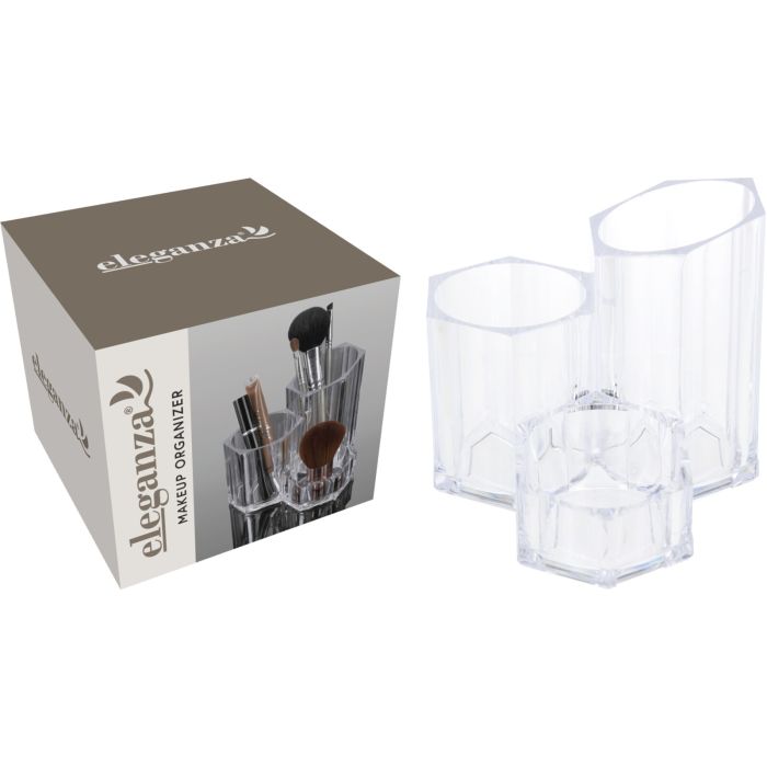Organisez votre coiffeuse avec ce support pratique et élégant pour accessoires de maquillage. Fabriqué en polystyrène transparent, il dispose de 3 compartiments pour ranger pinceaux, crayons, éponges ou autres essentiels beauté. Son design compact et moderne en fait l’allié idéal pour garder tout en ordre et à portée de main.