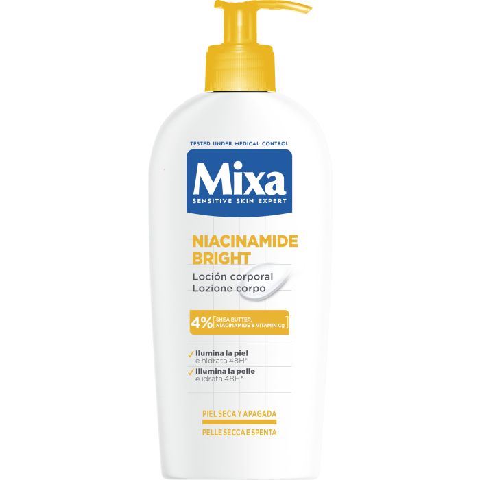 La lotion corporelle anti-taches MIXA Niacidamide Bright associe 4 % d’actifs puissants [niacinamide + beurre de karité + vitamine Cg] pour réduire tous types de taches et améliorer visiblement le teint irrégulier.