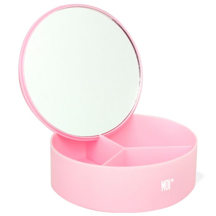 Miroir de coiffeuse avec base organisatrice MOI* : Un miroir de table portable avec plusieurs compartiments pour ranger vos accessoires et produits de maquillage. Le miroir s’emboîte dans la boîte, vous permettant de le transporter facilement et d’installer votre coiffeuse où que vous soyez.