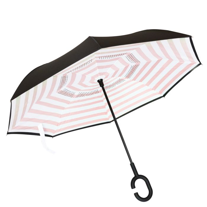 Parapluie réversible de MOI* : ce parapluie s’ouvre automatiquement par simple pression d’un bouton. Plus flexible et résistant au retournement grâce à ses baleines en fibre souple. Lorsqu’il se replie, la face mouillée reste à l’intérieur, évitant ainsi les éclaboussures. Sa double couche retient les dernières gouttes lorsque le parapluie est posé à l’envers. Fini les vêtements mouillés !