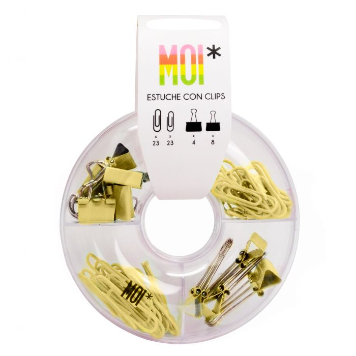 Set de Clips MOI * C'est un étui transparent qui comprend 23 clips doublés de grande taille, 23 clips doublés de petite taille, 4 clips métalliques grands et 8 petits clips métalliques. Tout cela dans la couleur de votre choix.