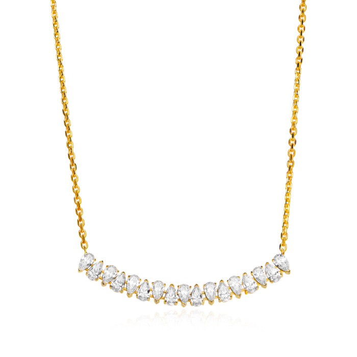 Le design du Collier Dhan se distingue par sa chaîne fine et élégante, qui complète parfaitement n'importe quelle tenue. La pièce centrale, une rangée de zircones en forme de poire, est disposée pour capturer et refléter la lumière à chaque mouvement, créant un effet resplendissant qui attire tous les regards.