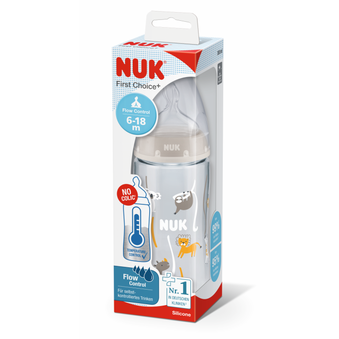 NUK a développé les biberons First Choice+ avec un large goulot pour s'adapter parfaitement à la tétine First Choice. Son goulot extra large facilite également le remplissage et le nettoyage des biberons. Il est doté d'un bouchon transparent et hygiénique. De plus, le disque étanche et anti-éclaboussures est idéal pour transporter ou mélanger le biberon. Il est également doté d'un système anti-colique qui minimise les coliques en empêchant l'ingestion d'air. Il est doté d'un contrôle de la température, qui permet de voir en un coup d'œil quand la bonne température de consommation est atteinte. Avec le control de température, l'échelle sur le biberon change de couleur en fonction de la température du contenu. Si les aliments sont trop chauds, l'indicateur normalement bleu devient blanc. Enfin, sa forme ergonomique permet une manipulation plus confortable et plus sûre de la bouteille. Sans bisphénol A. Capacité de 300 ml. Tétine de contrôle du débit.