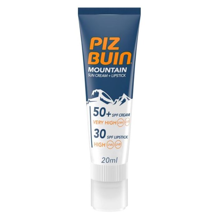 MOUNTAIN SPF50+ crème solaire + lipstick SPF30 de PIZ BUIN tout-en-un, protection pour les sports d'hiver.