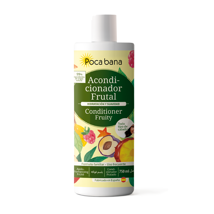 L'Après-Shampoing Fruité de Poca Bana nourrit, démêle et adoucit les cheveux sans les alourdir, les laissant légers, brillants et d'une douceur soyeuse. Sa formule contient 99 % d'ingrédients d'origine naturelle, enrichie d'un cocktail de fruits nourrissants —framboise, prune et ananas— qui apportent fraîcheur, vitamines et vitalité.