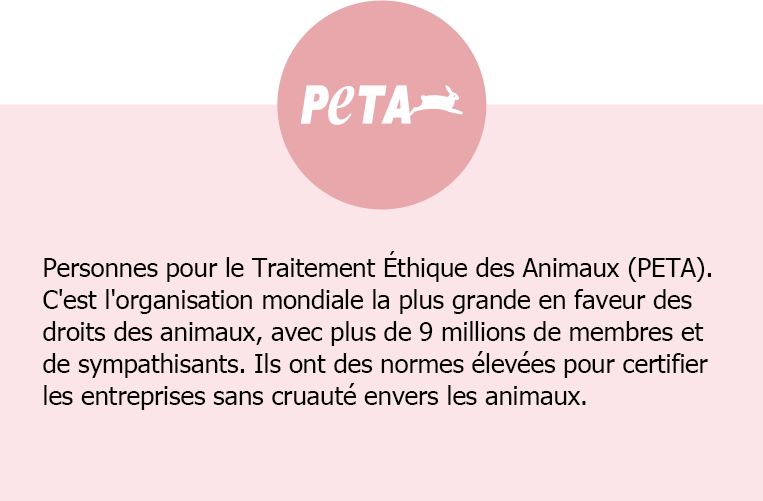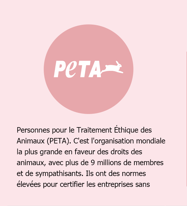 - Être certifié par une association autorisée telle que PETA, Choose Cruelty Free, Leaping Bunny ou Humane Society, entre autres.