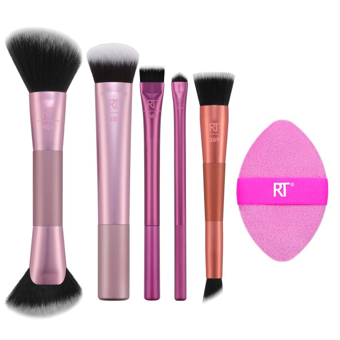 Contenu : (1) Pinceau éventail biseauté RT 454, (1) Pinceau blush RT 455, (1) Pinceau eyeliner pyramidal RT 364, (1) Pinceau yeux Layer + Liner RT 367, (1) Pinceau plat correcteur + contour RT 269, (1) Houppette pour poudres Miracle 2-en-1.