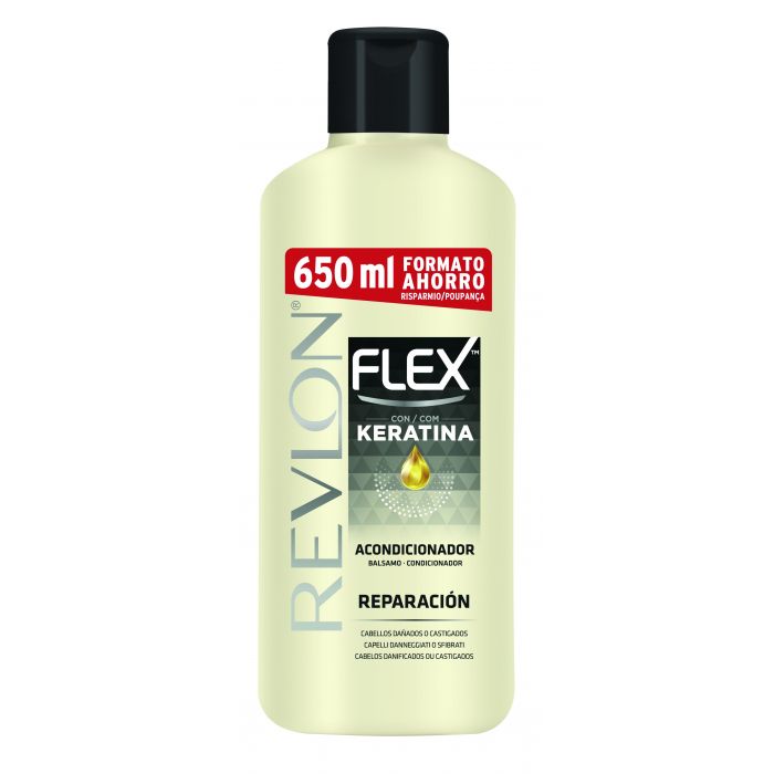 Flex Après-shampoing pour cheveux secs de REVLON : Après-shampoing à base de kératine pour les cheveux abîmés ou punis, qui renforce et répare les cheveux, de la racine à la pointe.