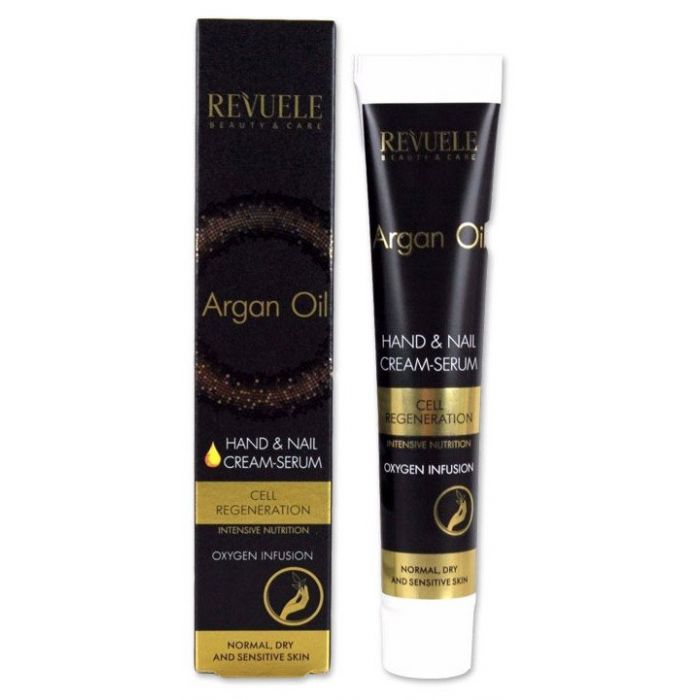 Revuele Crème-Sérum Mains et Ongles à l’Huile d’Argan : Crème régénérante adaptée à tous les types de peau, dotée d’une puissante formule anti-âge qui nourrit et hydrate la peau en profondeur.