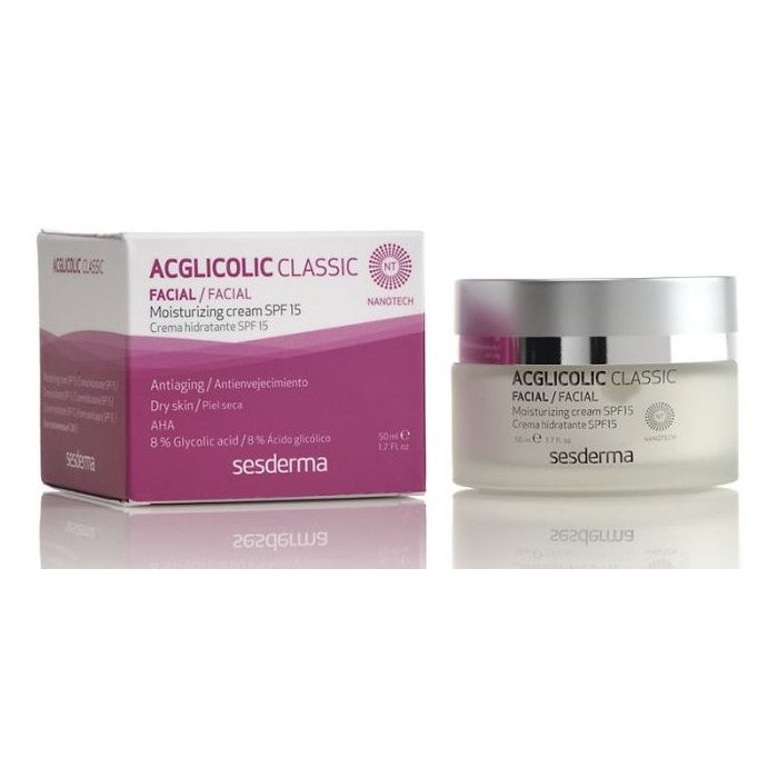 La Crème Hydratante Acglicolic Classic SPF15 de Sesderma est une crème de nuit contenant de l'acide glycolique qui prévient le vieillissement cutané, restaure son équilibre, hydrate et stimule la synthèse de collagène et d’élastine.
