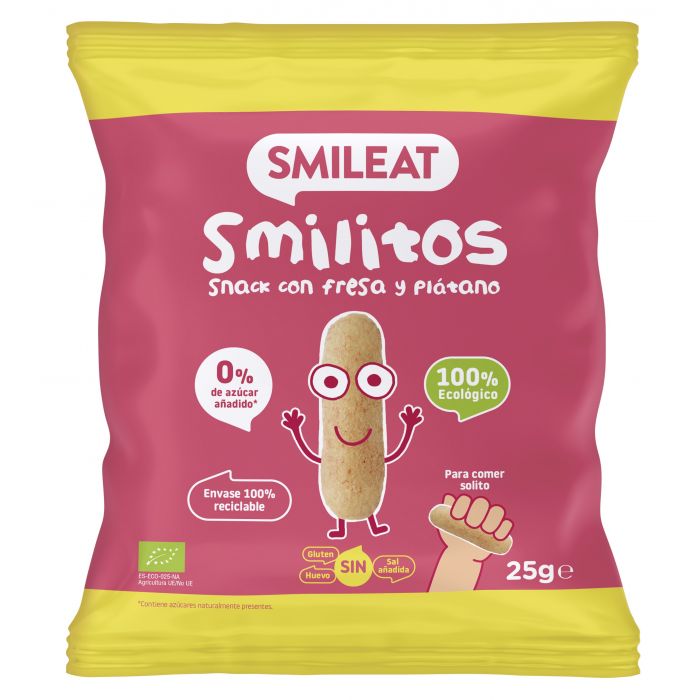 Snacks faits de maïs bio cuisiné au four et d’huile d’olive vierge extra 100 % biologique avec banane et fraise.