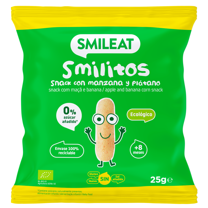 Snacks 100% bio à base de maïs et d'huile d'olive extra vierge avec de la banane et de la pomme.