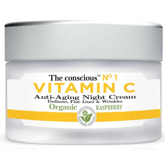 The conscious Crème de Nuit Anti-Âge à la Vitamine C illuminateur aux feuilles de framboise bio hydrate instantanément la peau, cible les rides et illumine le teint terne pour un teint uniforme et un éclat renouvelé.