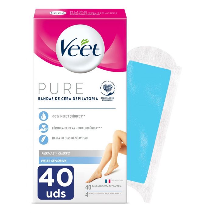 Veet Bandes de cire froide Jambes et Corps contient 20 bandes de cire dépilatoire et 2 lingettes de finition parfaite pour l’épilation des jambes et du corps. La formule de cire hypoallergénique Pure est recommandée dermatologiquement par la Skin Health Alliance, suite à une évaluation scientifique menée par une équipe indépendante de dermatologues.