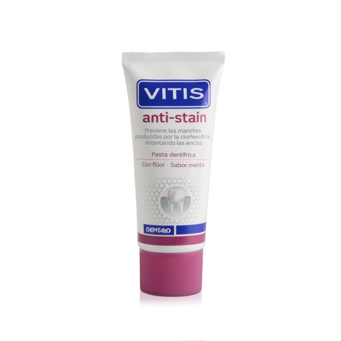 Vitis® Anti-Stain est un dentifrice spécialement formulé pour prévenir l’apparition de taches dentaires liées à l’utilisation de chlorhexidine, un antiseptique buccal couramment utilisé dans les traitements parodontaux, les chirurgies ou les implants dentaires.