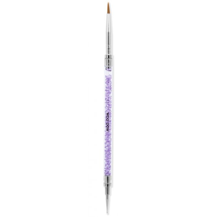 Pinceau double pour nail art Nº1. D'un côté, un pinceau ovale à pointe fine en poils synthétiques, idéal pour dessiner des feuilles, des pétales ou remplir de couleur des dessins et motifs plus grands. De l'autre, un pinceau métallique ultra-fin, parfait pour tracer des lignes, de nombreux motifs et de petits détails. Cet outil peut également être utilisé pour aider à fixer des strass et des paillettes.