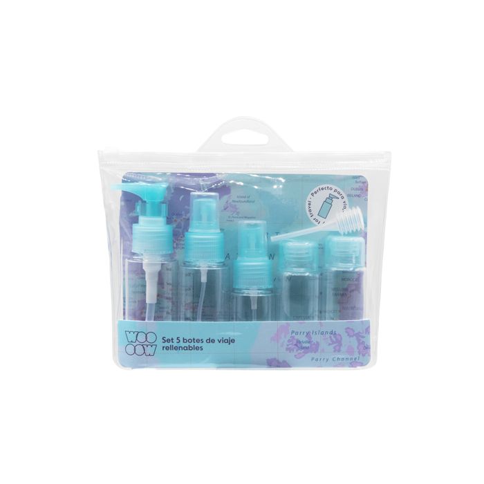 Set de 5 flacons verts transparents et rechargeables, parfaits pour être emportés dans vos bagages à main.