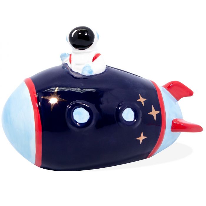 Tirelire en forme de vaisseau spatial avec astronaute.