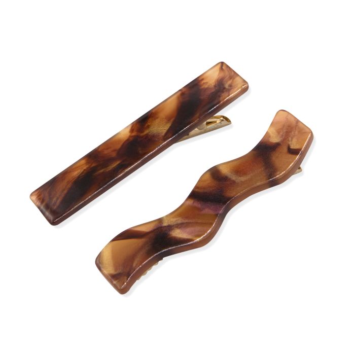 Les pinces à cheveux sont les reines du street style. Indispensables pour toute coiffure. Avec cet ensemble de deux clips originaux en ton carey, vous pouvez les assortir aussi bien avec des cheveux lâchés qu'avec des coiffures relevées.